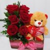 Ikebana com 6 Rosas Vermelhas+Chocolate 8un+Caneca Rosa