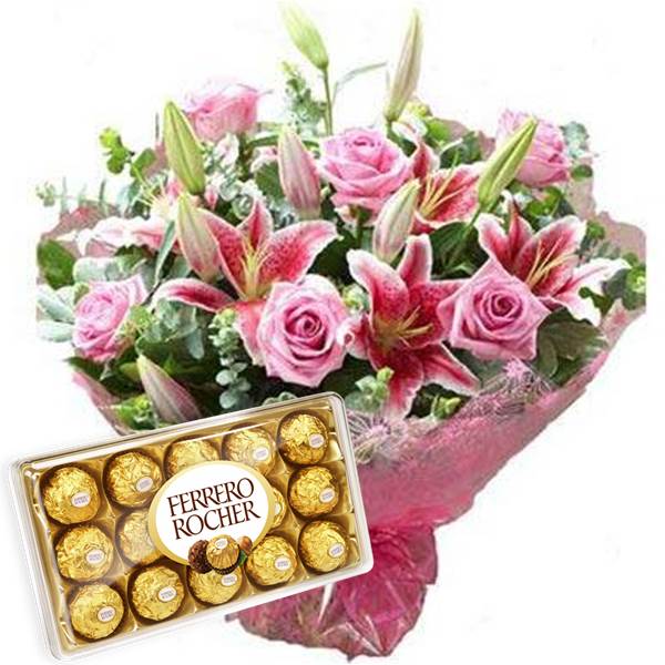 Buquê com 12 Rosas cor Rosa e Lírios Rosa +Chocolate 12un