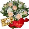 Buque com 12 Rosas Vermelhas+Chocolate 12un+Coração com pés 18cm