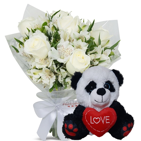 Mini buquê com 6 Rosas Brancas e Astromélias Brancas+Pelúcia 20cm