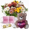 Mini buquê com Astromélias Coloridas+Urso 25cm “Te Adoro Muito”+1Caneca “Senssação…”+Chocolate 3un